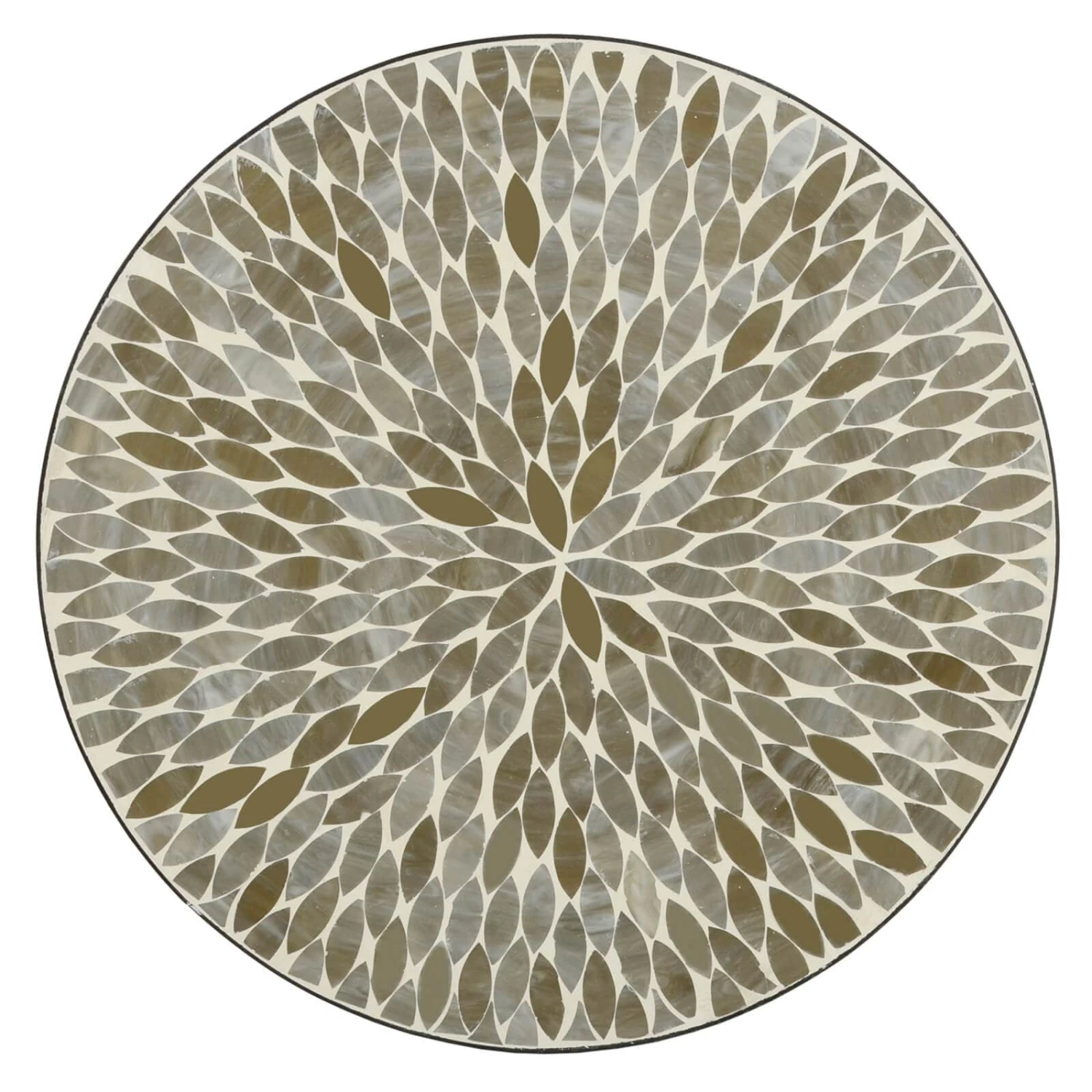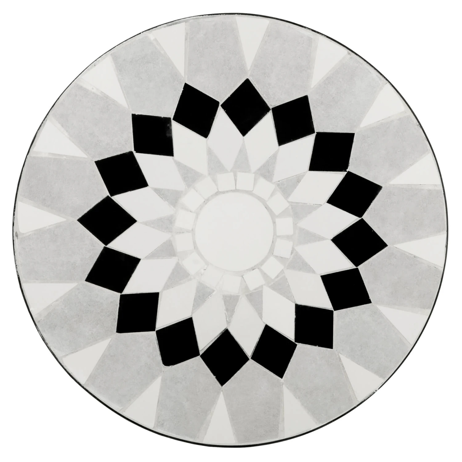 Each bistro set includes a round metal table with curved legs. The tabletop features a stunning hand-finished ceramic tile and cement mosaic pattern.