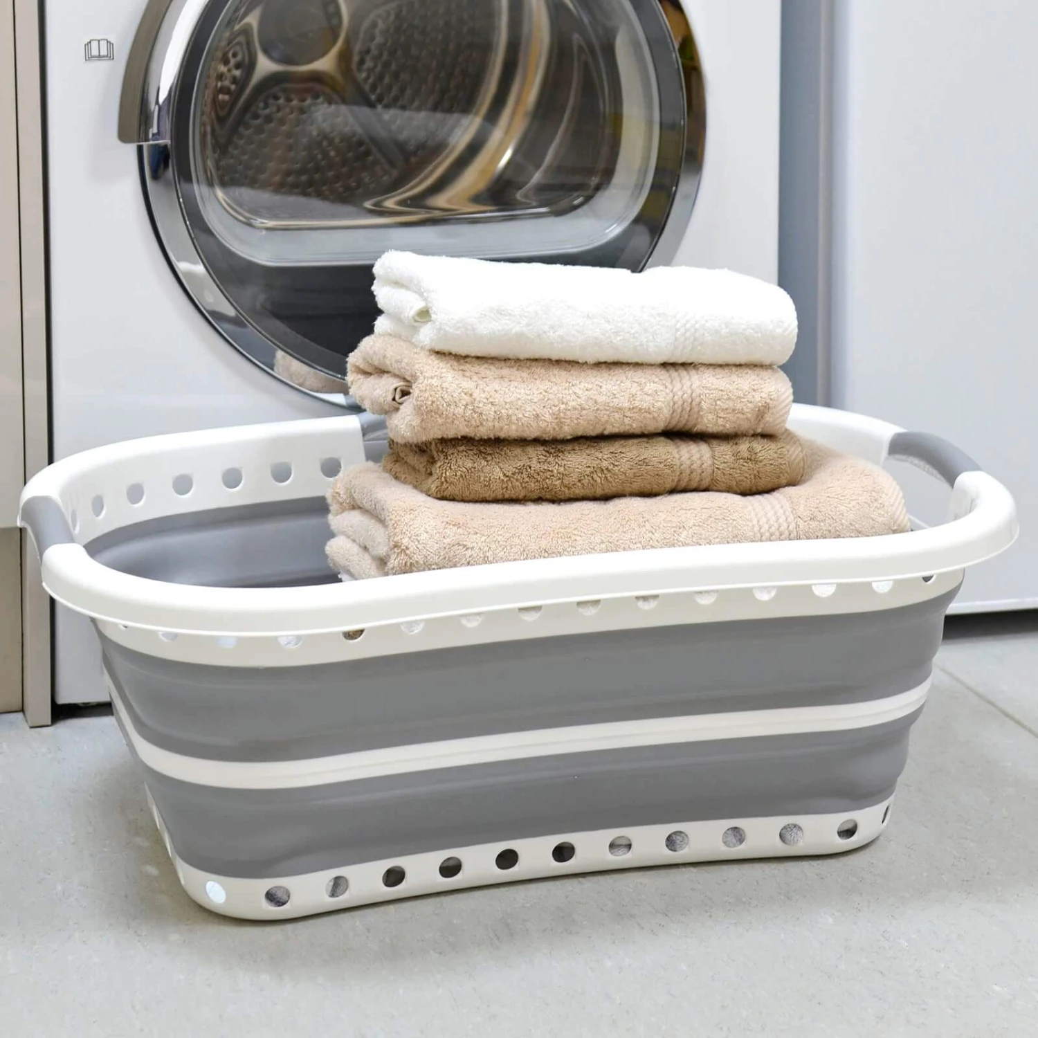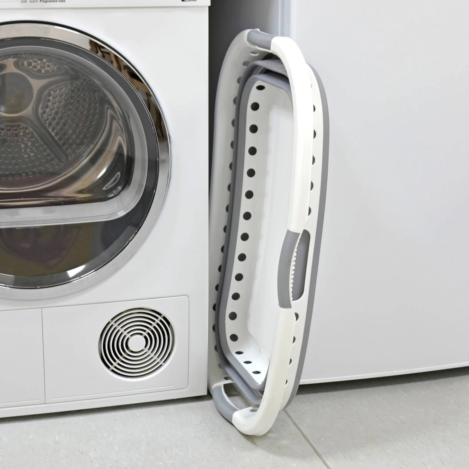The handy grey and white clothes basket features a gently curved side that rests against your hip and 3 easy grip handles. It folds flat for space saving storage after use. The perfect kitchen accessory for studio flats, small kitchens and caravans.
