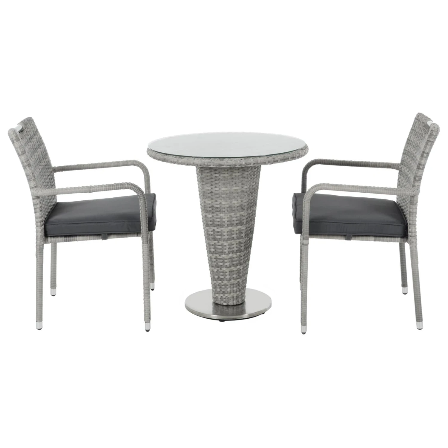 The Cone garden bistro set from Azuma is great for lunch al fresco and relaxing outdoors this summer. The set includes a glass top round table with cone shape rattan and stainless steel base, and two grey rattan chairs. The chairs are stackable to save space when in storage. This eye-catching bistro set garden furniture is perfect for patios, decking, terraces and balconies.