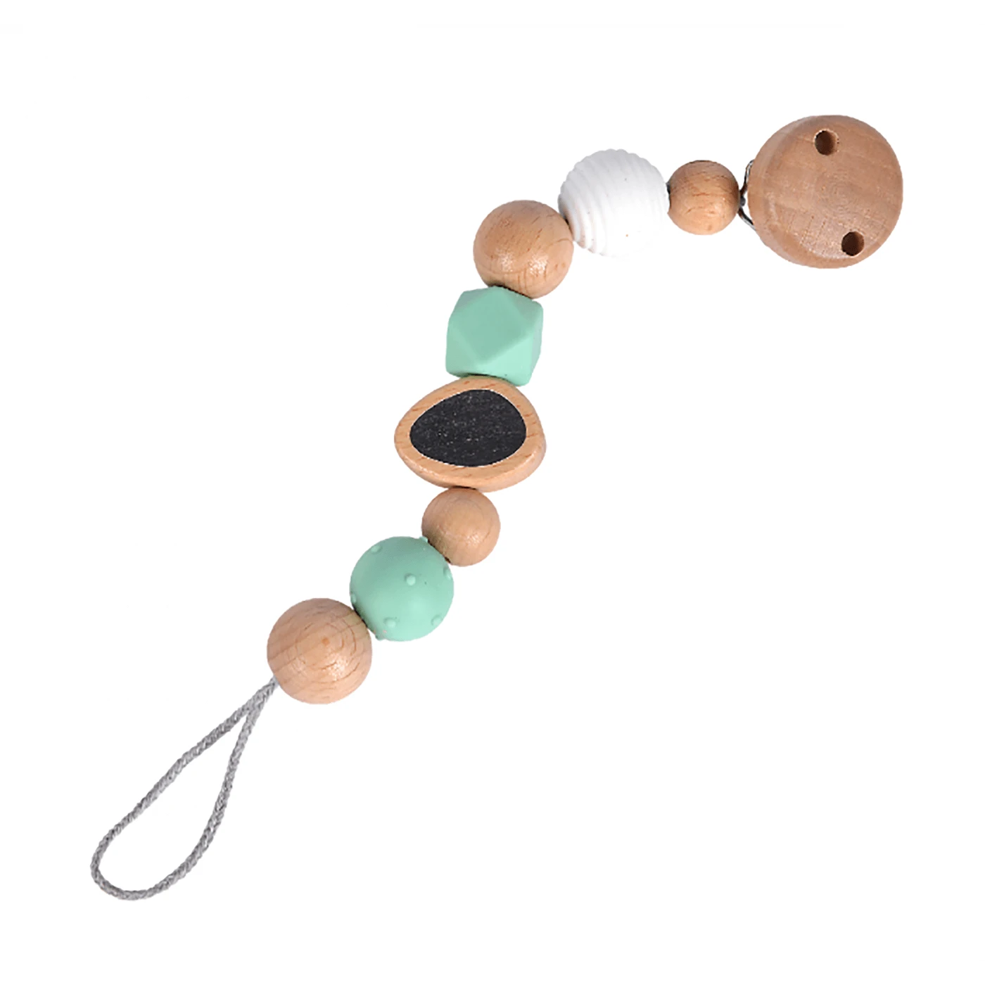 The 19cm long,high-quality dummy chain is made of beech wood with different tactile charms. The assorted texture beads provide a sensory experience for little hands and an eye-catcher for their eyes. Suitable for babies from the first months of life.