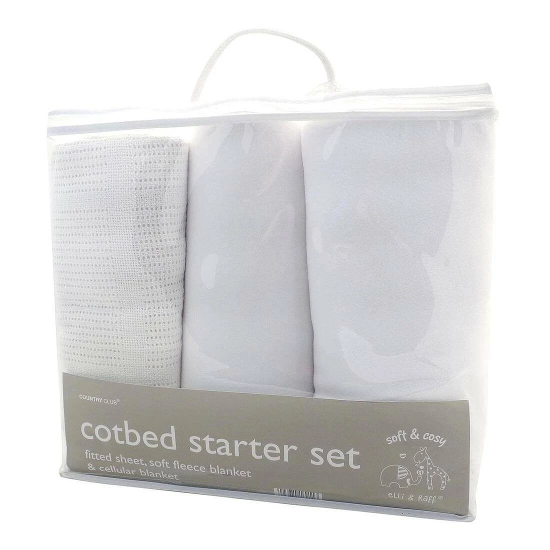 • Includes fitted sheet, fleece blanket & cellular blanket
