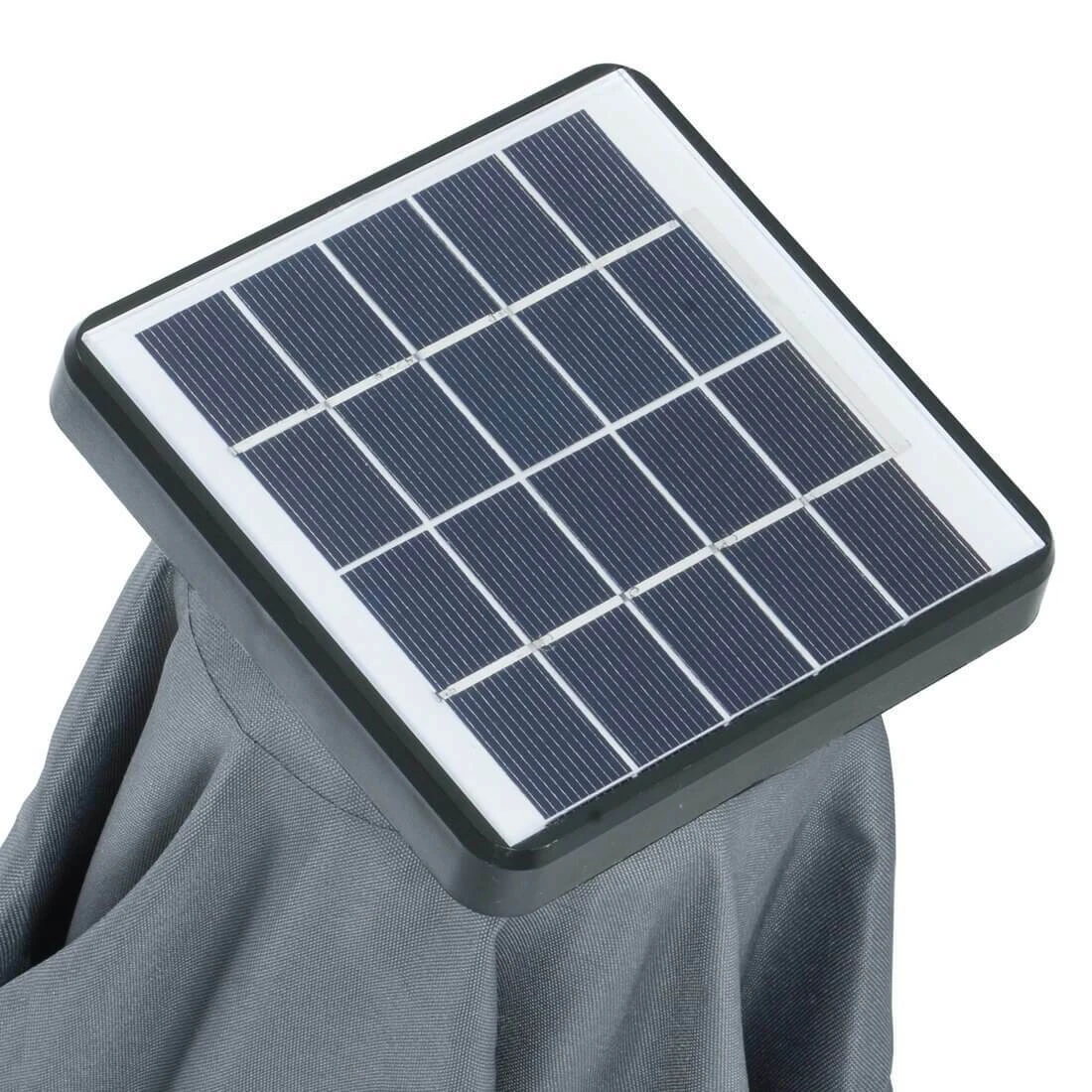 Please note: this parasol has a fixed height and does not include a base. Do not leave the canopy open in stormy weather. Regularly clean the surface of the solar panel for best results.