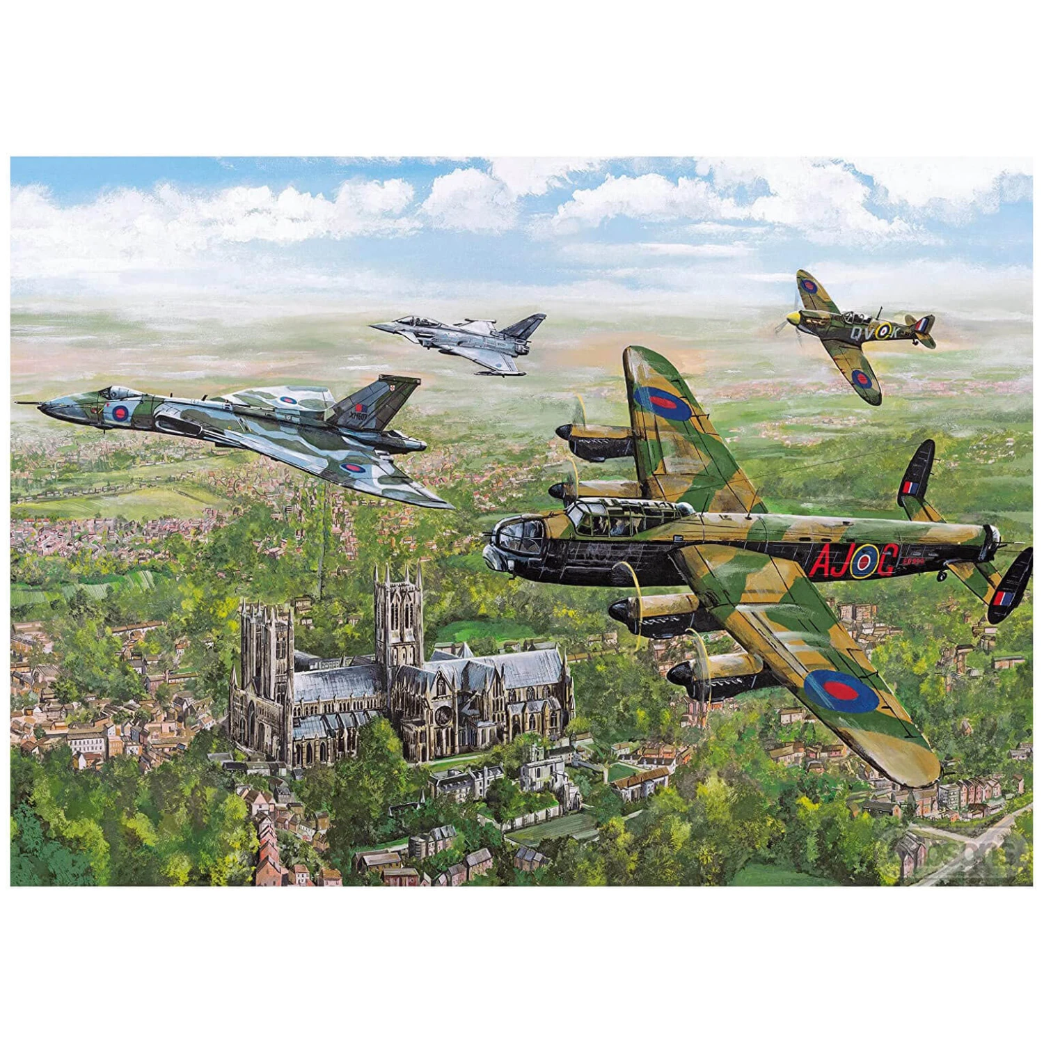 Flying gracefully over Lincoln Cathedral, these four aircraft highlight the importance of past and present UK air defence. In this jigsaw puzzle the Lancaster bomber and Spitfire are shown breaking away from the formation, to symbolise old heroes moving aside to make way for the Vulcan and the Typhoon, as the RAF continue their story.