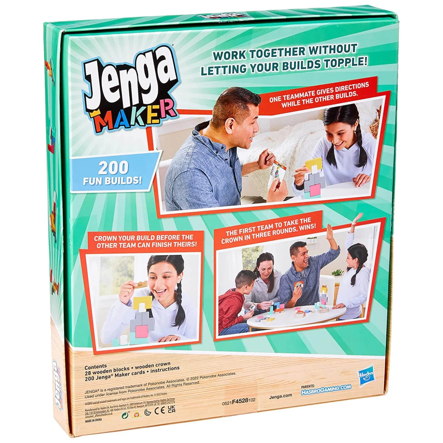 Box contents: 28 wooden blocks, wooden crown, 200 Jenga Maker cards and instructions