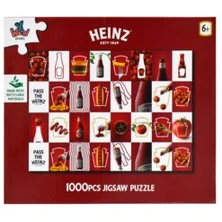 This 1000 piece puzzle celebrates the iconic Heinz Tomato Ketchup! The puzzle design is made from a collage of images including the classic shape bottle, a burger, steak, chips and hot dogs. All with a generous portion of Heinz tomato sauce!