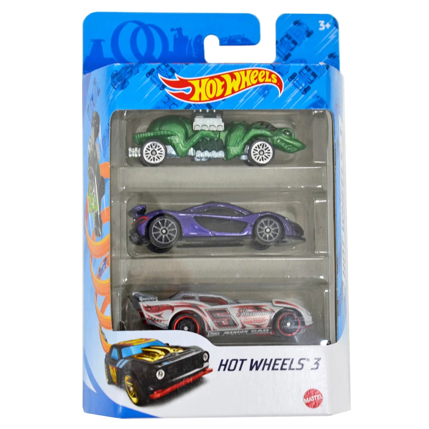 Start or add to your Hot Wheels collection with this 3 car pack. The Hot Wheels triple pack appeals to collectors, car enthusiasts and racing fans of all ages. Each vehicle is featured at 1:64 scale with realistic details and authentic decos. Suitable for ages 3+