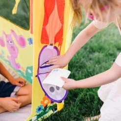 The front door rolls up and the letterbox flap opens and closes, revealing a slot for the included postcard. The imaginative play space features a chimney on the roof, mesh windows for ventilation, and durable floor material. It’s easy to assemble and easy to pack away in the handy take-along storage tote.