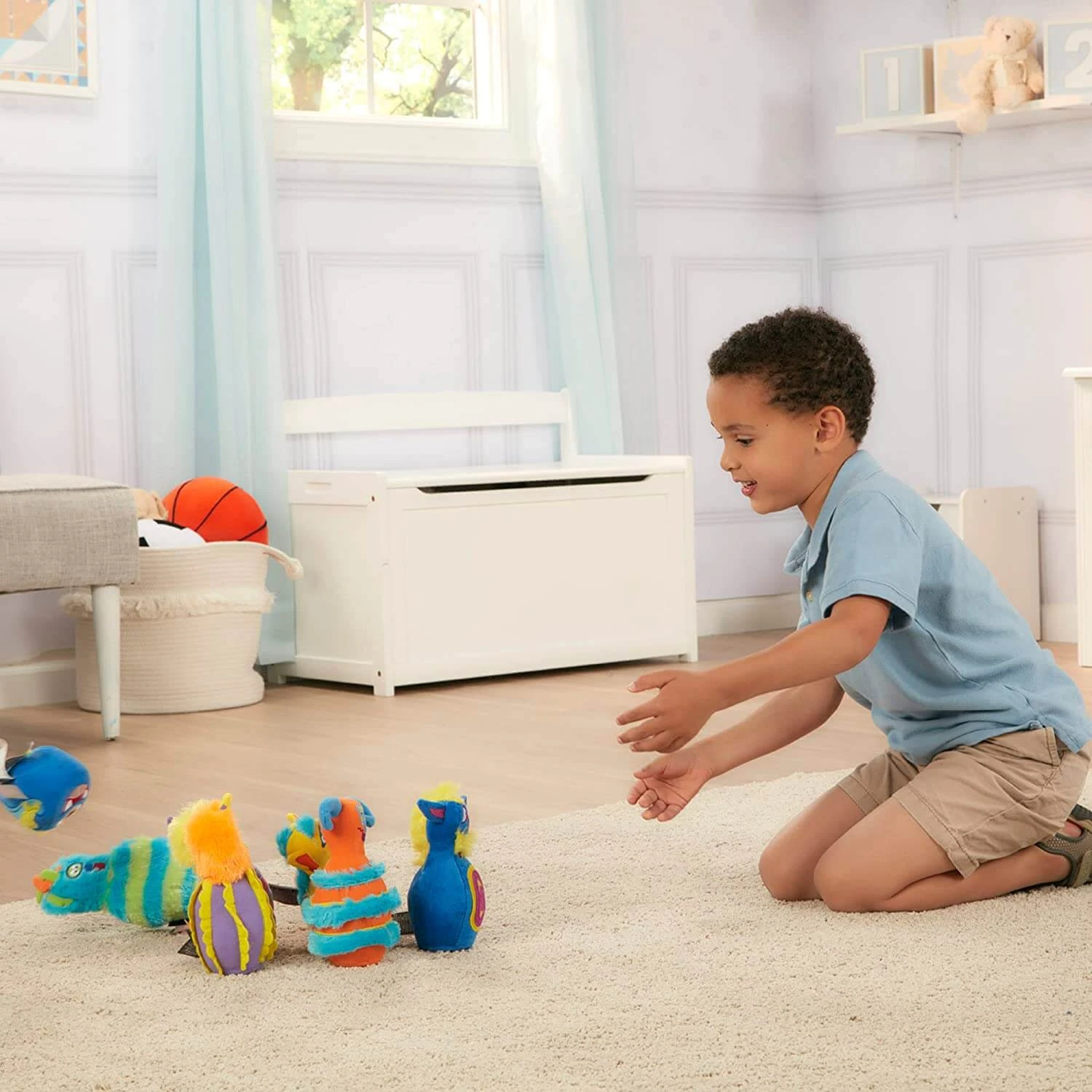 Six wacky plush pins with goofy expressions have weighted bases for extra stability, touchable textures, and detailed stitching. Set up the pins in different formations, then use Klonk, the silly stuffed ball, to knock them down!