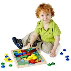 The Melissa & Doug Sort and Snap Colour Match has ten reversible picture cards that are held in place on a wooden play board when children place the snap caps in the holes. On one side of the picture card is in colour for matching. The reverse side shows the picture in black and white, allowing children to create their own patterns and designs!