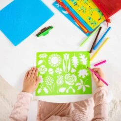 Box contents: 12 stencil sheets, 1 double sided rubbing plate, 10 sheets of paper (8″ x 10″), 6 marker pens, 2 crayons, 2 crayon holders, storage pouch