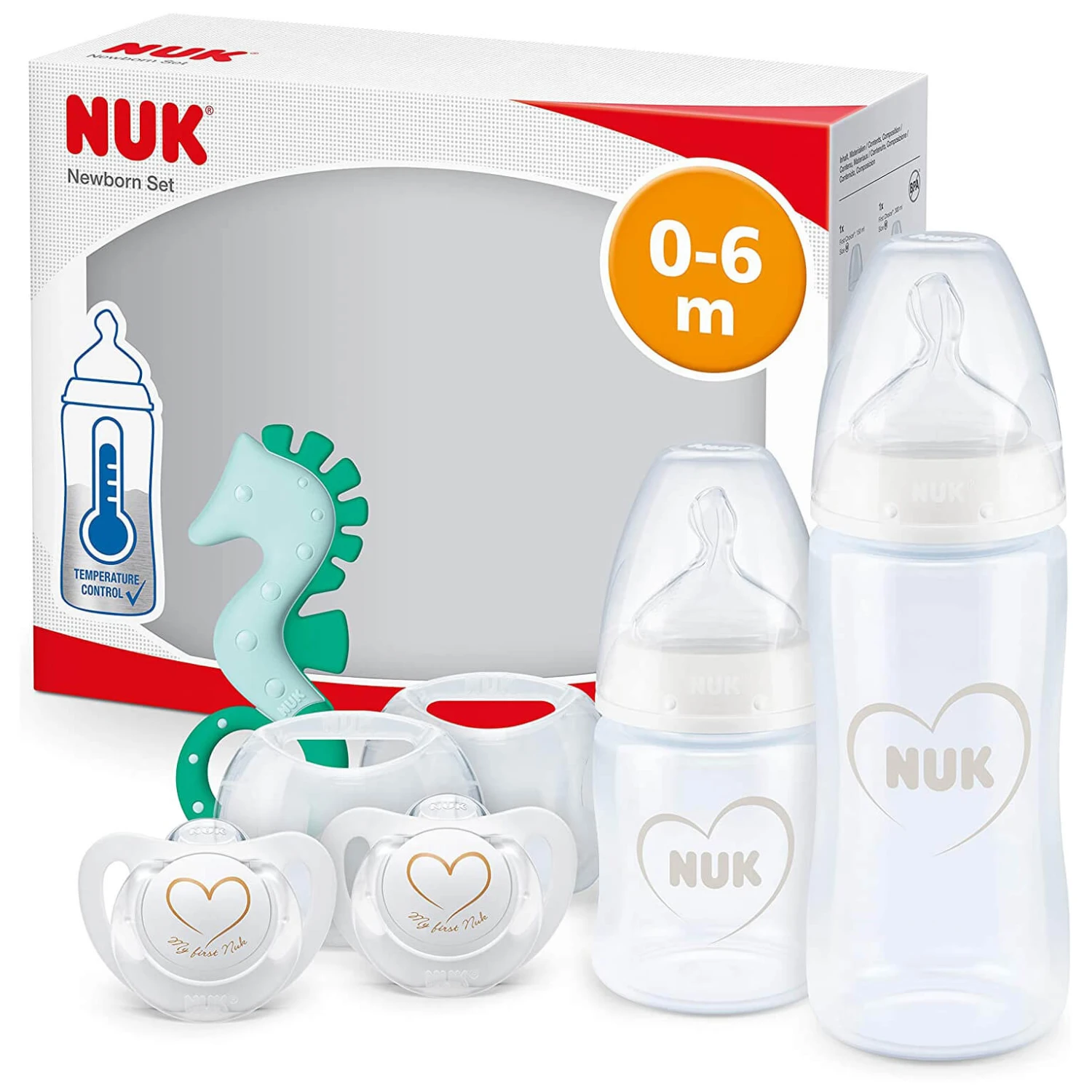 Ensure your baby gets the best start with the NUK Newborn Set. The set contains 2 bottles, 2 soothers and a teether. The bottles have orthodontic shape teats and Anti-Colic air system to ensure a natural flow to help your baby drink without swallowing air. The NUK baby bottles also have a temperature control indicator to reassure you that the contents are not too hot.