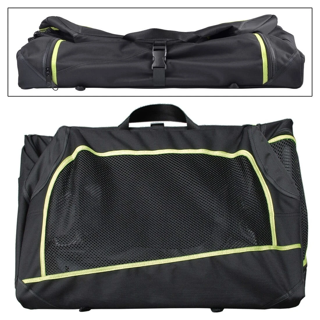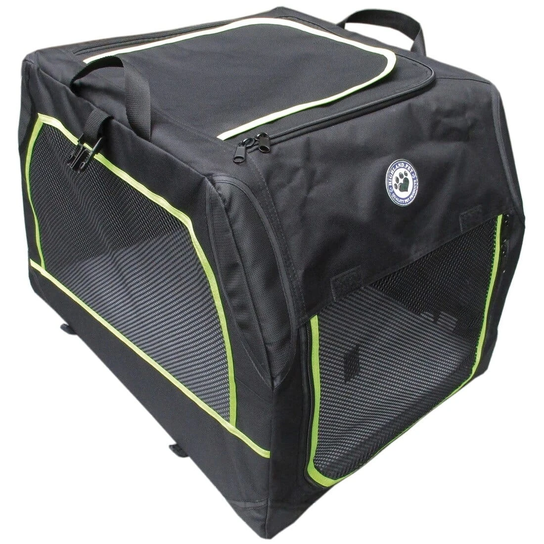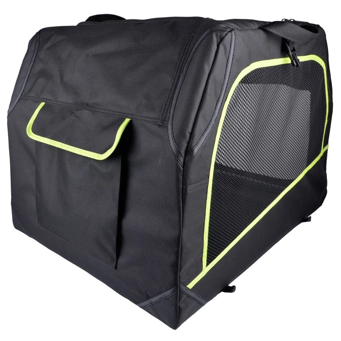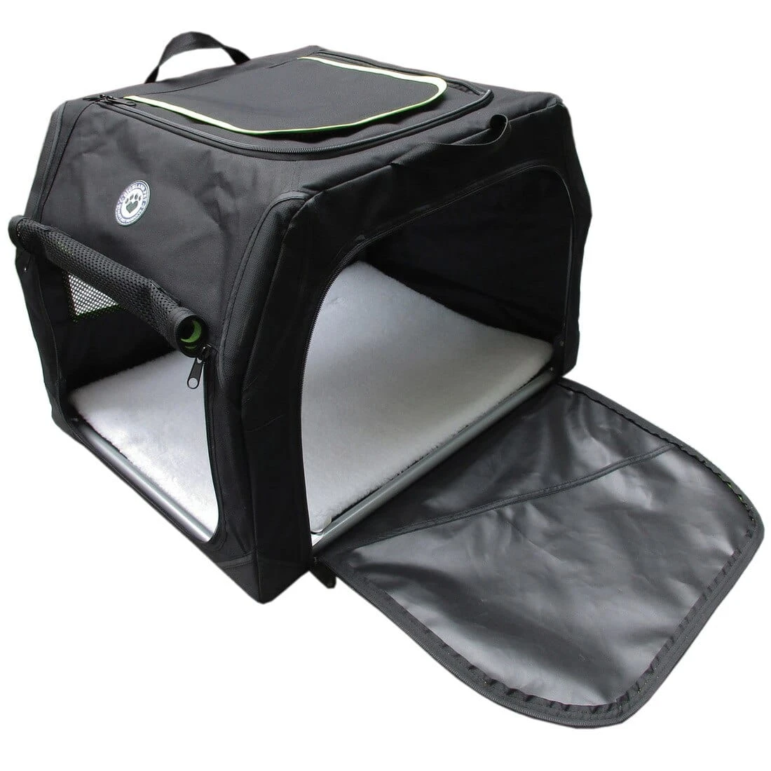 Strength: A sturdy but lightweight iron tubing frame gives this kennel a strong structure. Black, tight weave Oxford fabric with green trim is tough and hardwearing. Great for every day use.
