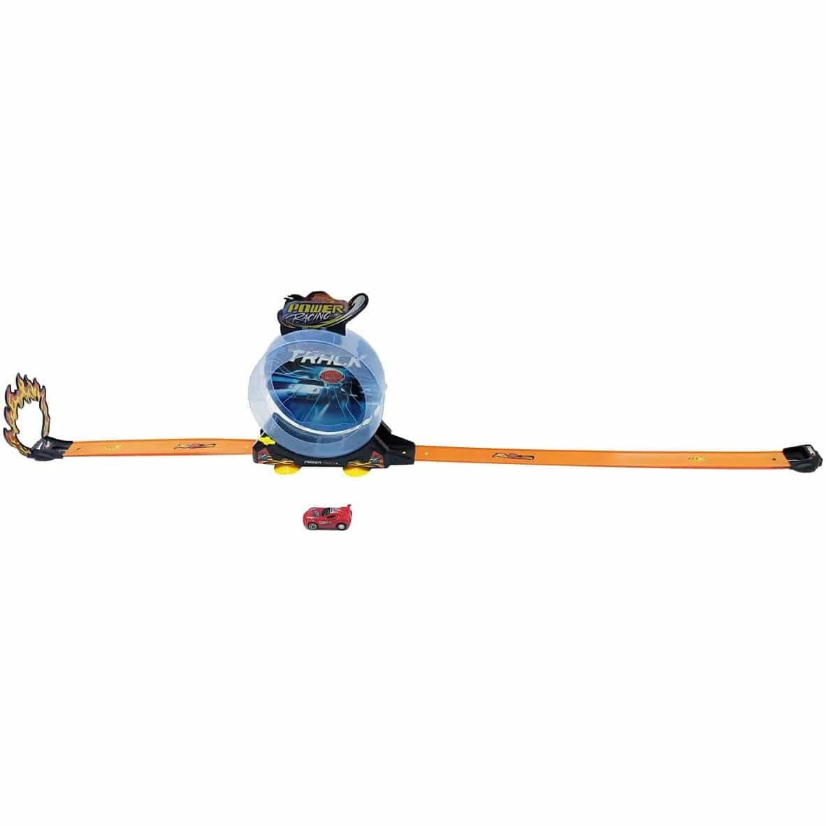 Spinforce 360 is a high speed pull back car track set with infinity loop centrepiece and one car. Wind the car up, place at the start of the track and release. The car will speed into the 360 infinity loop and will continue spinning until player manually opens escape door. Time it right and race out to victory. Time it wrong and watch the epic crash. Suitable for ages 3+